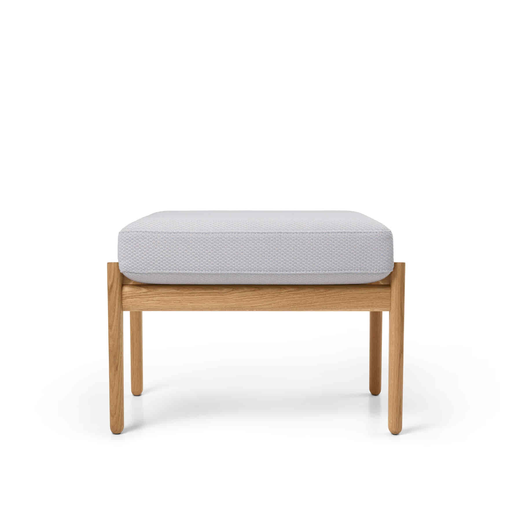 Fodskamlen er opbygget omkring en FSC™-certificeret ramme i eg, hvor de modstående, let hævede sider skaber en fin indramning af den polstrede sædehynde. Stoffet tilfører en blød kontrast til det synlige massive egetræ og understreger seriens balance mellem tydelige tømrerdetaljer og enkle, rolige former.