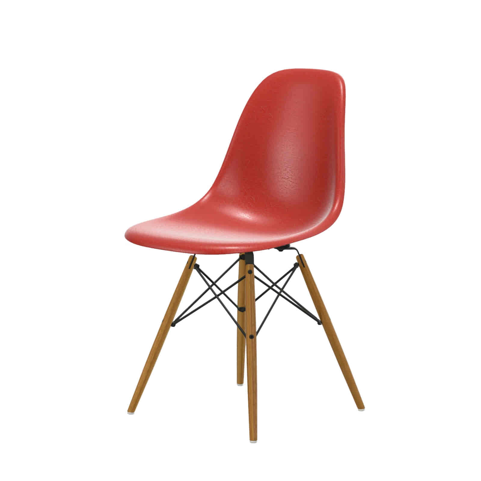 Eames Fiberglass DSW (Dining Height Side Chair Wood Base) kombinerer den organiske sæde skal med et firebenet træunderstel og fremstår som et tidløst ikon af Charles and Ray Eames. Sædeskallen er fremstillet af fiberglas, hvilket giver stolen en karakteristisk overfladestruktur med tydelige fibre og en næsten naturlig finish.