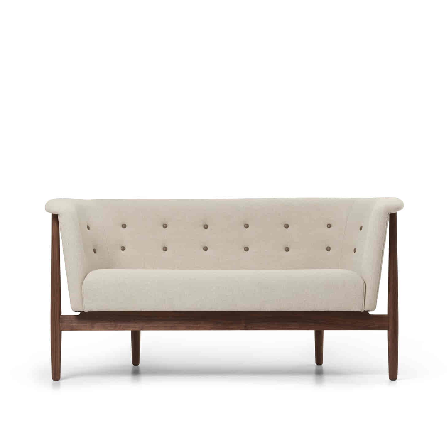 ND52 Vita Sofaen, skabt i 1952, repræsenterer dette brud med traditionen. Sofaens formgivning bevæger sig væk fra datidens stramme geometri og ind i et mere organisk univers. Den slanke træramme bærer en skulpturel skal med høj, omsluttende ryg, der giver møblet et let og svævende udtryk. Den præcise håndpolstring – markeret gennem knapper, stramme linjer og et veldefineret sæde – tilfører en elegant kontrast til sofaens bløde kurver.
