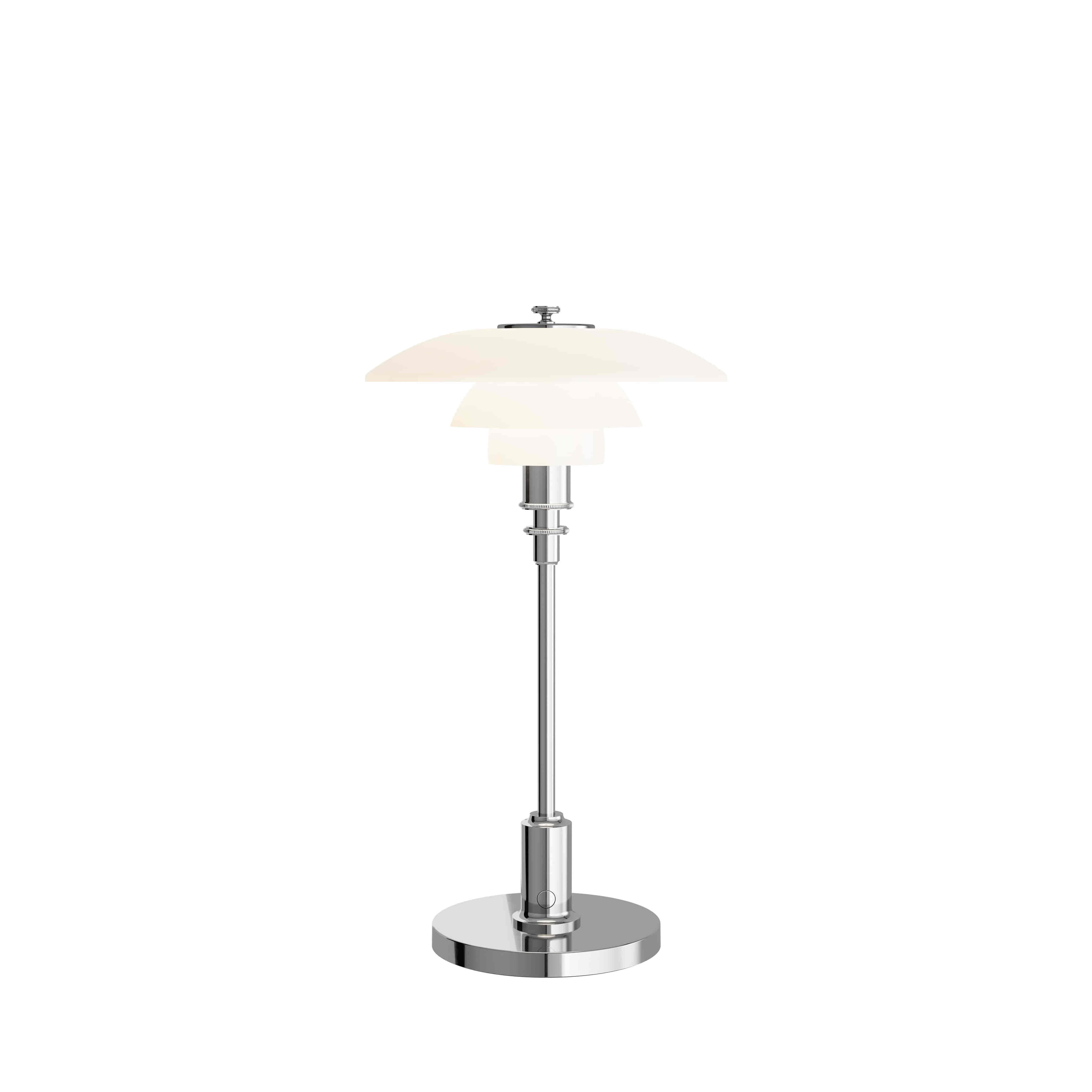 Den bærbare version bevarer alt det, PH 2/1 er kendt for: de mundblæste, trelags skærme i hvidt opalglas, der giver en diffus og stemningsfuld glød, kombineret med en elegant stilk og fod i enten højglansforkromet finish eller metalliseret messing. Resultatet er en lille, raffineret bordlampe med stor visuel karakter – diskret i størrelse, men markant i udtryk.