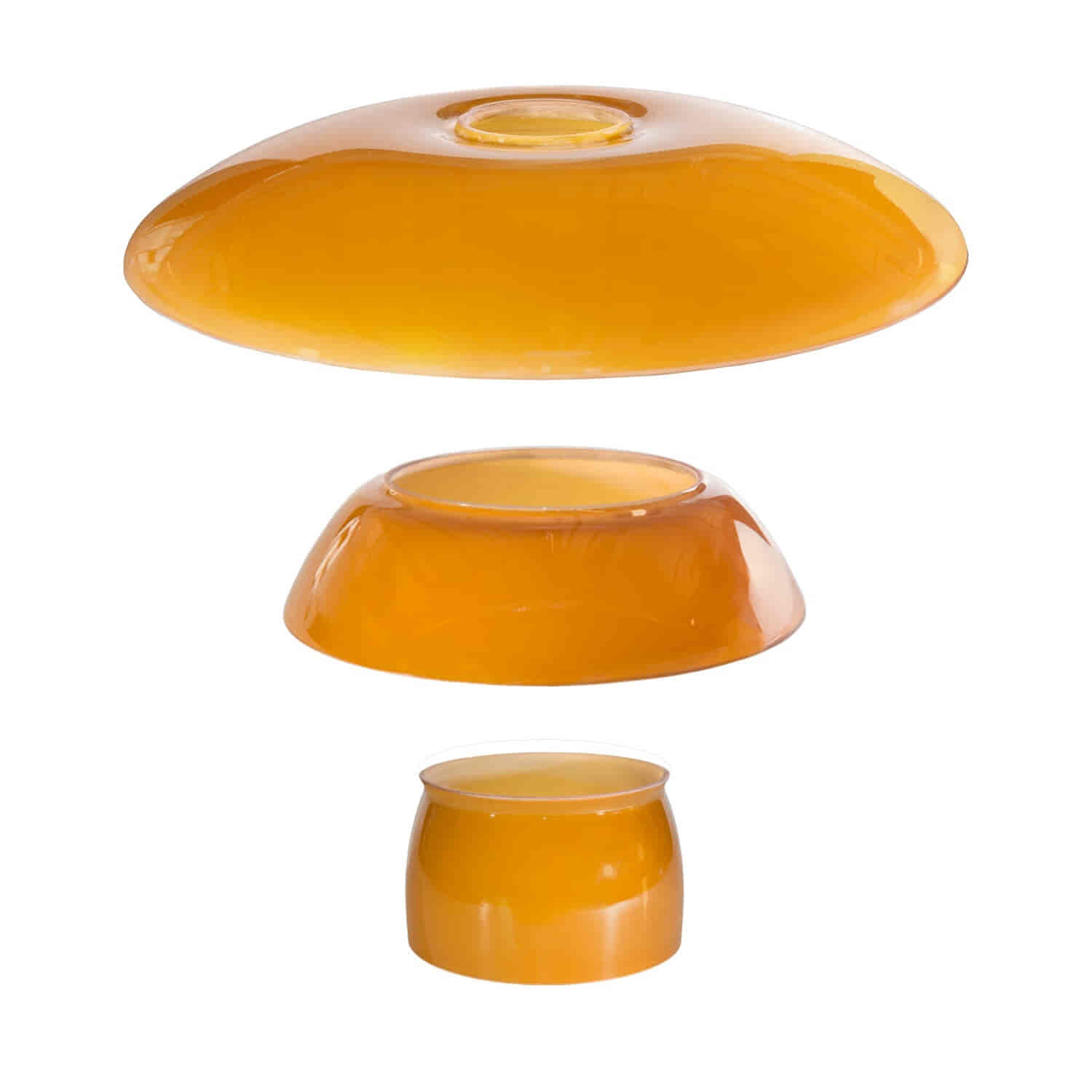 Disse originale reserveskærme i ravfarvet glas er designet til PH 3½-3 og bevarer lampens karakteristiske formsprog og blændfri lysprincip. Skærmene er udført efter Poul Henningsens berømte treskærmssystem, hvor proportioner og afstande er nøje afstemt for at sikre en behagelig og funktionel lysfordeling.
