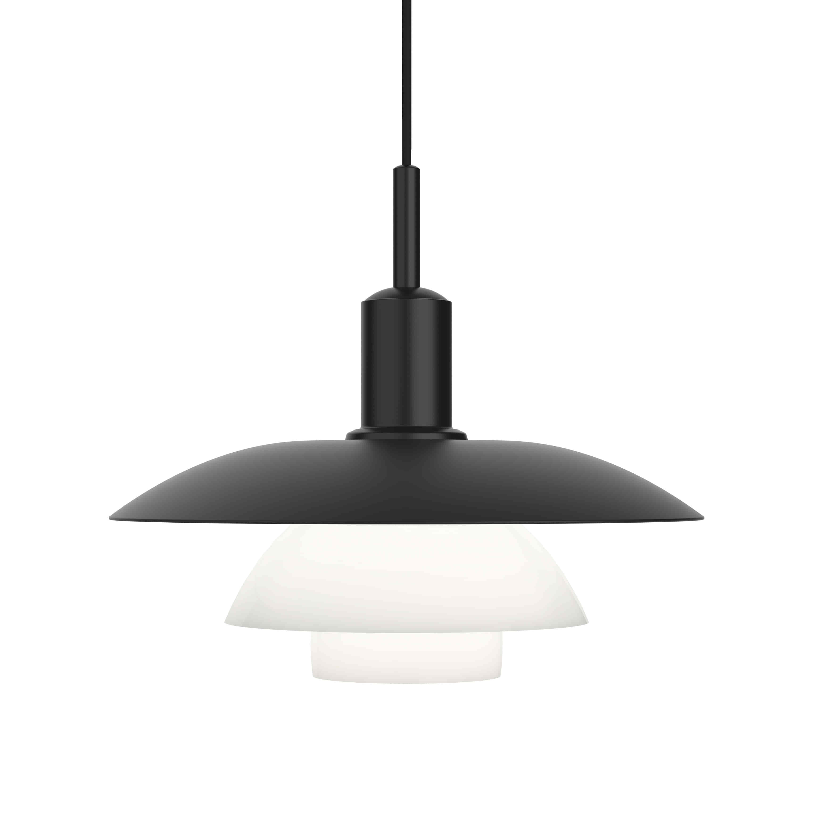 Skærme: Mat sort pulverlakeret, optrukket aluminium eller mundblæst hvidt opalt glas.