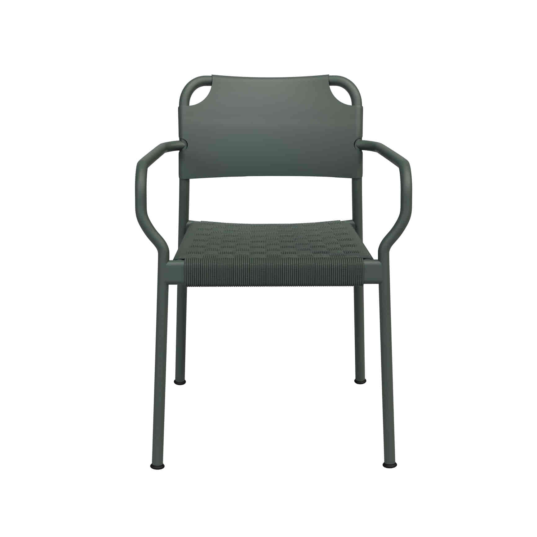 Stolen er fremstillet i aluminium med en mat, struktureret pulverlakeret overflade, som giver både holdbarhed og en raffineret finish. De integrerede armlæn tilfører ekstra komfort og gør stolen ideel til længere ophold ved spisebordet eller til afslappede stunder i haven.